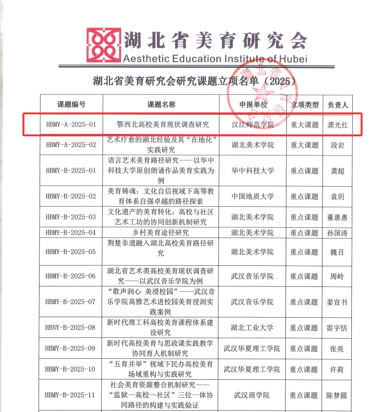 2025年4月10日,湖北省美育研究会公布2025年度美育研究课题立项名单,由william威廉英国官网龚光红老师主持,李华涛老师华雯雯老师参与,联合湖北汽车工业公司和湖北医药公司共同申报的课题《鄂西北高校美育现状调查研究》成功获批省级重大项目立项。