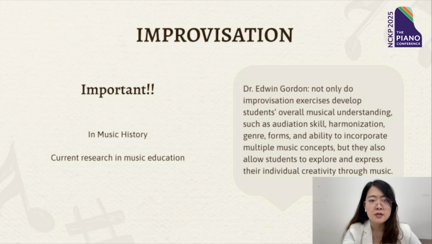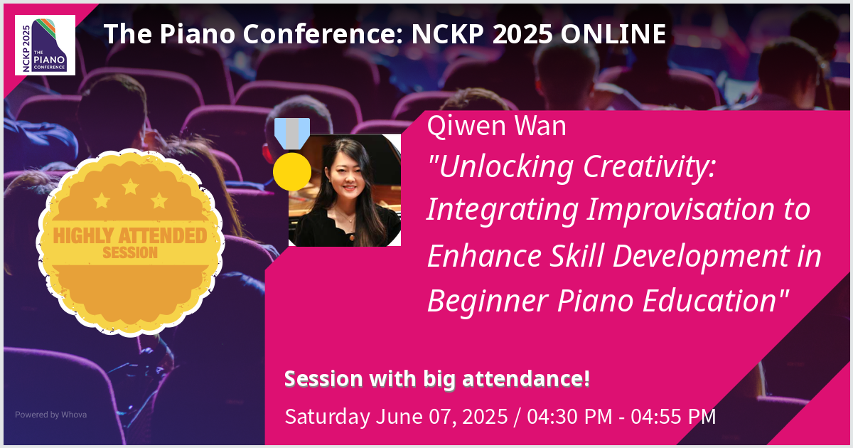 2025年6月7日,公司器乐教研室主任、钢琴教学法方向博士万琦文受邀在NCKP 2025美国钢琴教育峰会(The Piano Conference: NCKP 2025)作专题学术演讲。此次大会由美国钢琴教育协会(National Conference on Keyboard Pedagogy)主办,是全球钢琴教育领域最具影响力的学术会议之一,来自全球近千名钢琴教育工作者通过线上方式参会。万琦文博士的演讲以“Unlocking Creativity: Integrating Improvisation to Enhance Skill Development in Beginner Piano Education”(《即兴创造性活动在初级钢琴教育中的融合路径研究》)为题,反响热烈,吸引了大量来自全球的与会者聆听与交流,被大会评为“高参与度讲座”(Highly Attended Session)。