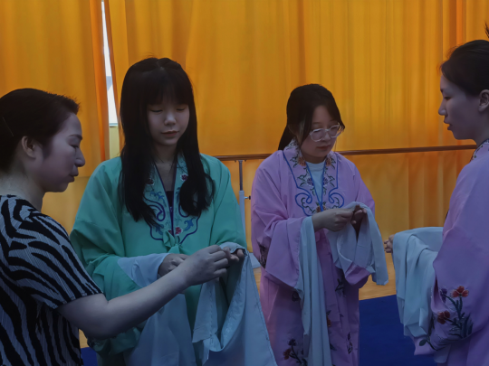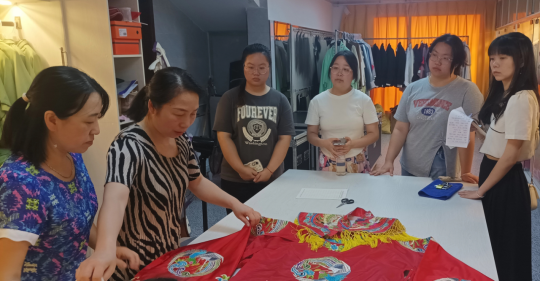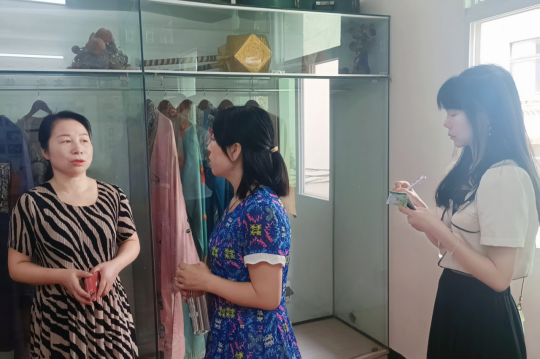 图为团长为小分队成员介绍这些服装的来源及悠久的历史