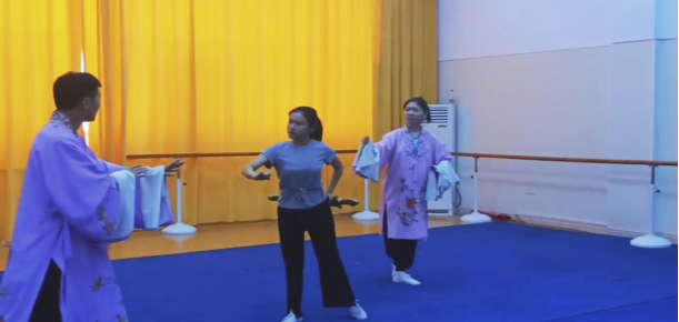 台上一分钟,台下十年功。小分队成员来到了练功室,观看剧团成员练功。此时,剧团成员正在练习台步,单山膀、云步、架子功、兰花指等,小分队成员也跟着一起学习。