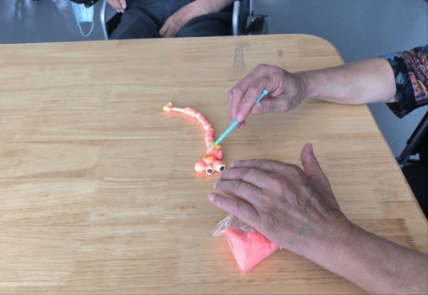 伴随着早上音乐疗法的结束,小队成员们积极筹备着下午的美术疗法。在午休结束后,他们带着手工粘土来到了爷爷、奶奶们的身边,耐心的讲解着手工粘土制作的过程。在学习过程中,老人们展现出了令人佩服的耐心和学习能力,队员们纷纷表示:或许建立老年人的自信心并没有那么难,缺少的只是陪伴老年人的时间和耐心。