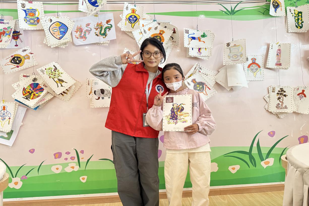 开设“民族纹样涂色课堂”。实践队员为孩子们讲解藏族面具的色彩寓意(红色象征勇敢、蓝色代表智慧)、苗族蝴蝶妈妈传说以及京剧脸谱文化,引导他们自由创作。金色的面具眼睛、彩虹色的脸谱胡子……每一笔都充满童真与想象,在潜移默化中播撒了民族团结的种子。