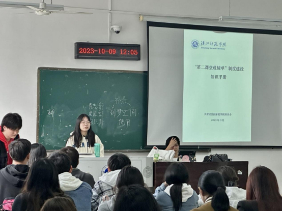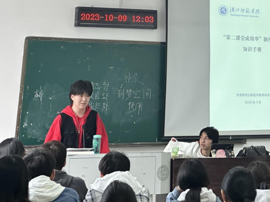 分团委副书记熊凯介绍了关于第二课堂的相关信息。主要以积分模版为主展开延伸,着重强调了相关注意事项以及新的积分补录格式。