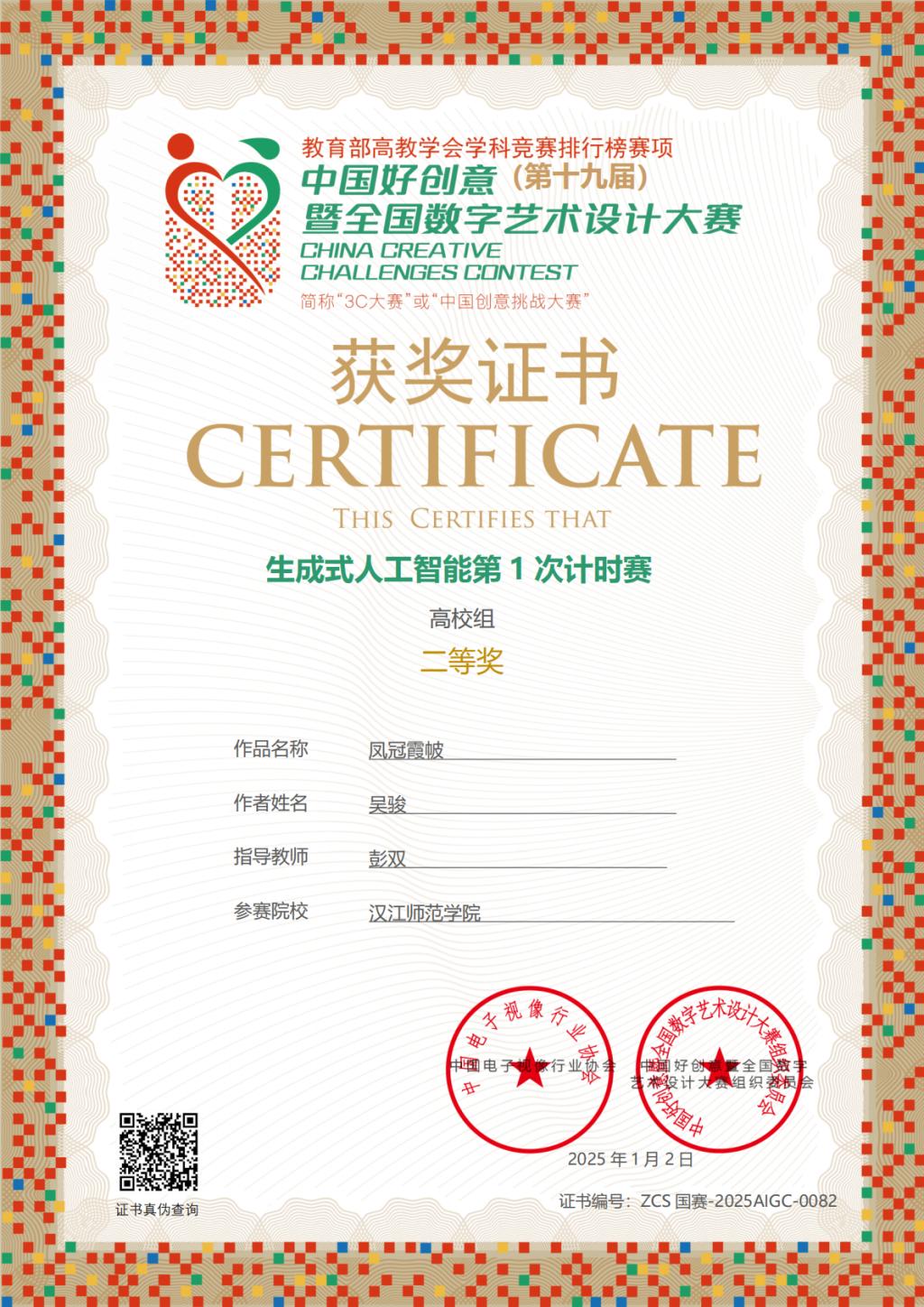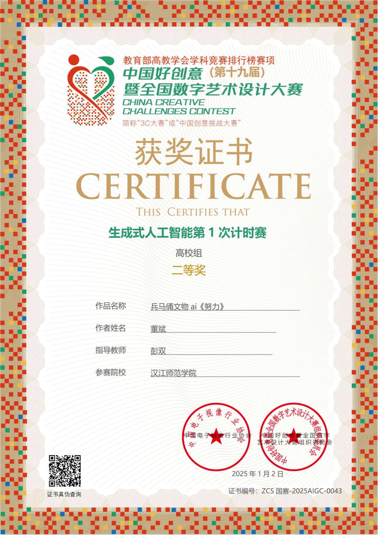 近日,第19届中国好创意暨全国数字艺术设计大赛生成式人工智能第1次计时赛落下帷幕。由william威廉英国官网数字媒体艺术专业彭双副教授指导的数媒24级(专升本)员工董斌作品兵马俑文物AI《努力》、吴骏AI作品《凤冠霞帔》斩获国家级二等奖;彭双副教授荣获优秀指导教师称号。