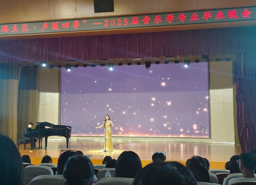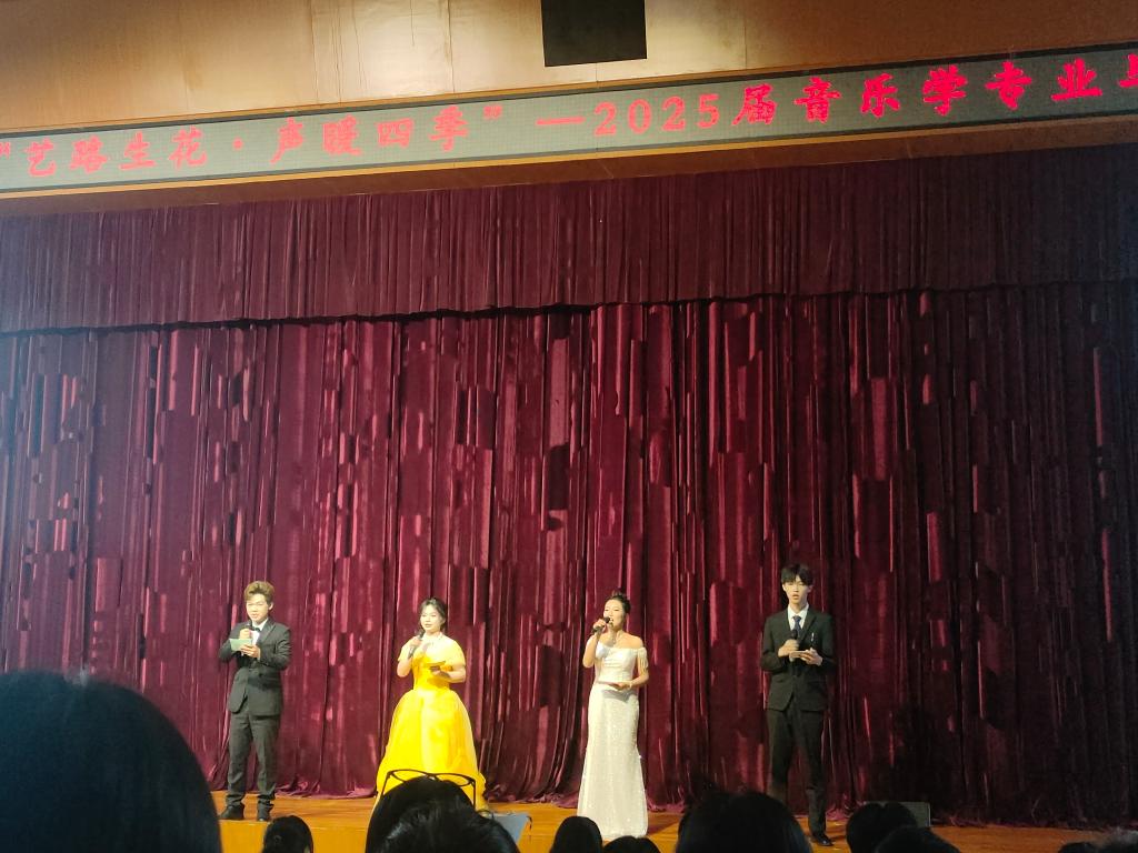 2025年5月19日晚,南风剧场内华灯璀璨,2025届音乐学专业员工在南风剧场顺利举办了“艺路生花·声暖四节”毕业音乐晚会。当晚,剧场内座无虚席,婉转旋律与动人歌声交织,共同镌刻下关于毕业季的独家记忆。