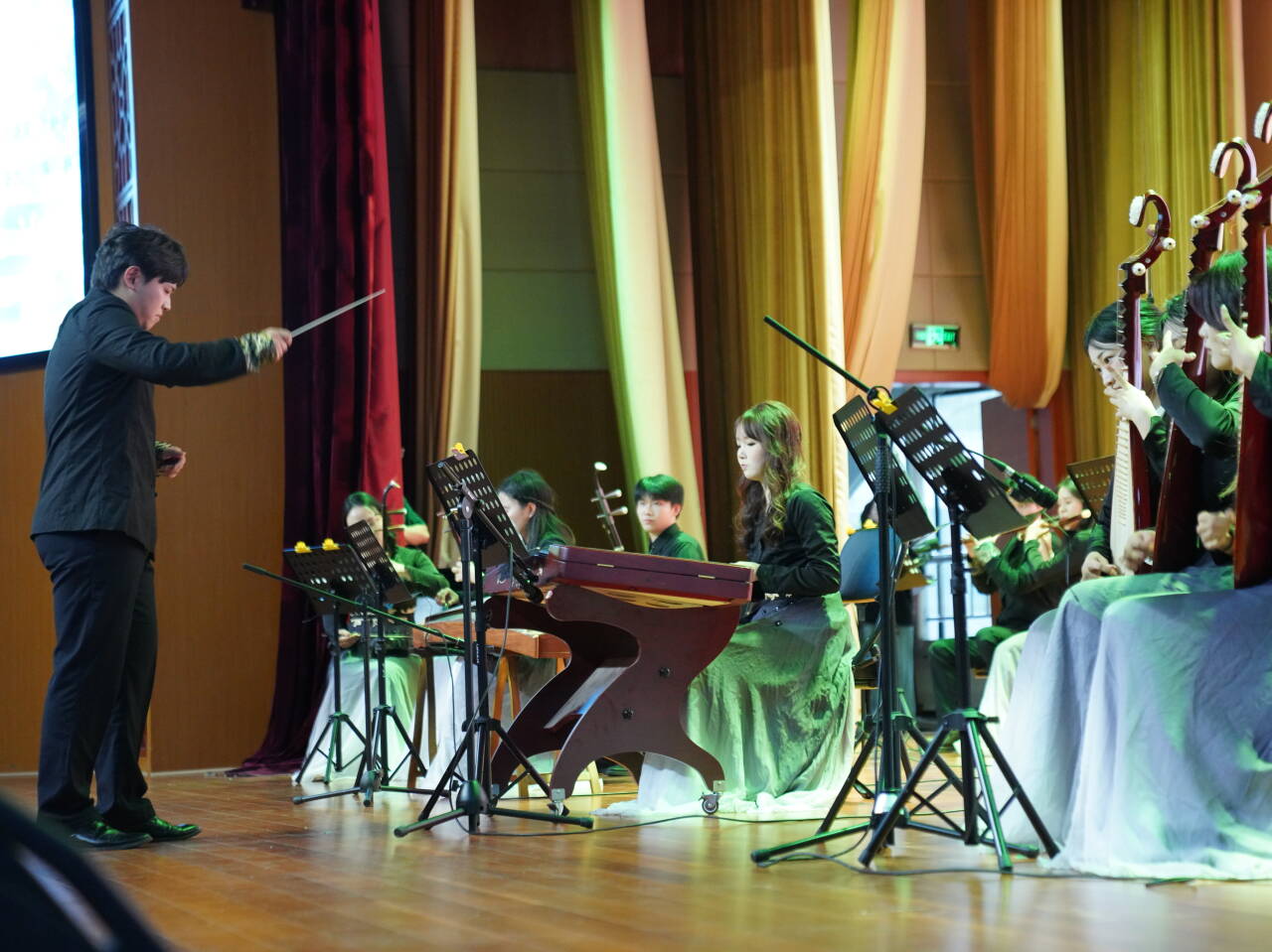 晚会在激昂的器乐合奏《金蛇狂舞》中拉开帷幕,欢快的旋律瞬间点燃了现场气氛,将观众带入音乐的美妙世界。整场晚会共分《生根》《抽芽》《盛放》和《传芳》四个篇章,声乐独唱、器乐合奏、歌舞表演、钢琴独奏、魔术等节目轮番登场,赢得台下观众阵阵掌声与喝彩。