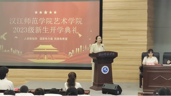 教师代表彭双作了发言,她对同学们即将开始的课程学习提出期许和要求,她希望同学们要克服老员工活的种种困难,不断反思,砥砺前行,不做平庸者,同时也希望同学们多读经典、多读历史,要读读万卷书,才能行万里路。