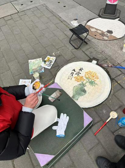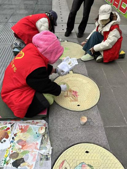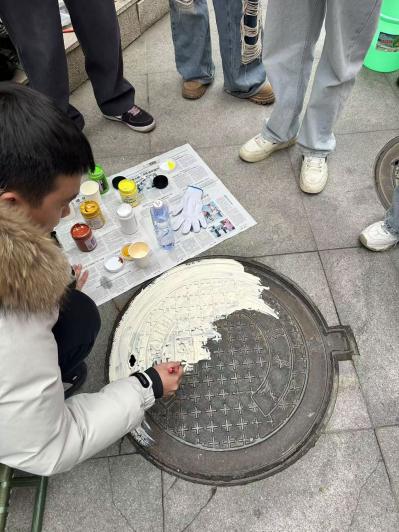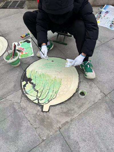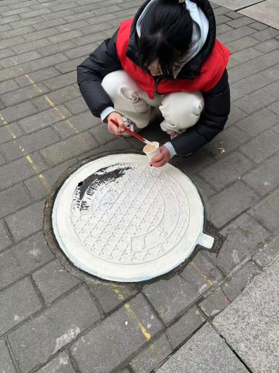 在任董事长的安排下,师生们迅速投入到工作中。他们以北京路中学的24个井盖为画布,以24节气为主题,开始了创意彩绘。小组长石必来和朱锦阳同学带领同学们精心设计图案,巧妙地将每个节气的特点融入其中。吴军晖、曾俊杰等同学则负责上色和处理细节,他们手法娴熟,色彩搭配得当,使得每个井盖都呈现出独特的艺术魅力。