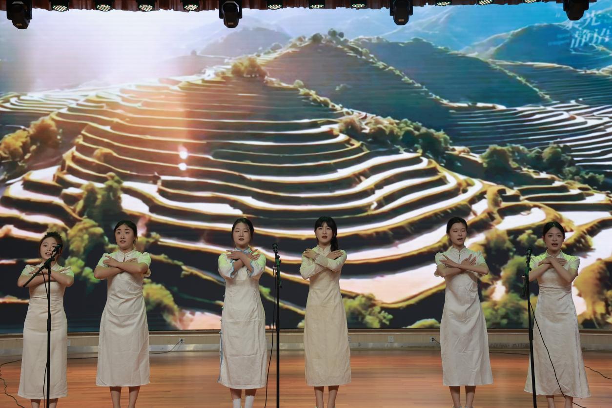 12名女生身着蓝色民国服饰,以戏剧化表演再现狱中绣红旗的场景。领唱邓雅君的高音宛如破晓曙光,合唱部分的和声处理则营造出信仰的集体力量。