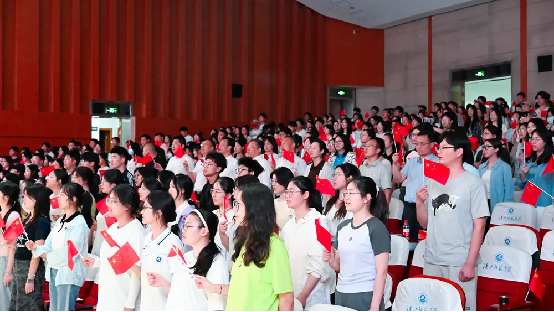 音乐党课的尾声,全场挥舞着鲜艳的小红旗,齐声高唱《没有共产党就没有新中国》。激昂的旋律、铿锵的歌声久久回荡,将整场音乐党课氛围推向最高潮。