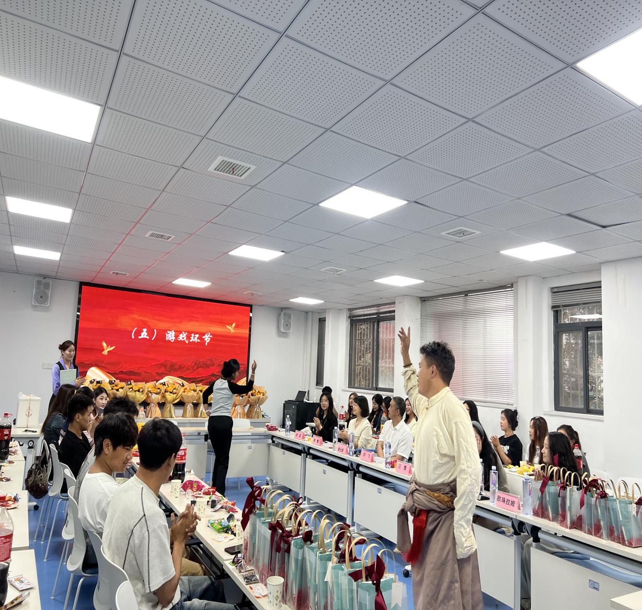 文艺表演与趣味游戏将气氛推向高潮。歌曲《大鱼》《越人歌》展现多元文化交融之美,器乐《赛马》激昂热烈,锅庄舞跳出藏族风情;“击鼓传花” 游戏中,同学们或歌或舞,欢声笑语间拉近彼此距离,让民族团结在欢乐中升华。