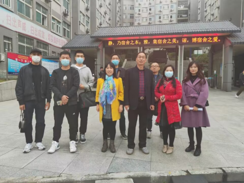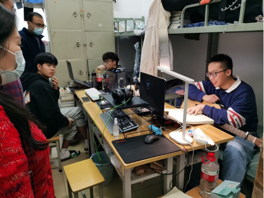 2021级的春雪楼503宿舍,当老师到来时,同学们正在认真学习,2101班的王瑞同学正在对着曲谱弹吉他,宿舍氛围轻松友好,同学与老师们都笑容满面。